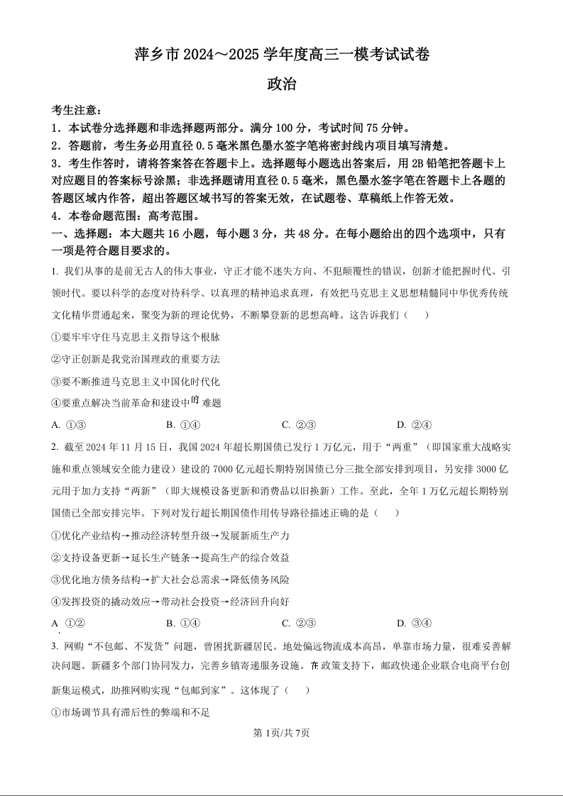 江西省萍乡市2024-2025学年下学期3月高三一模考试政治(原卷版)