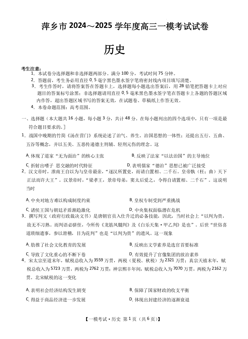 江西省萍乡市2024-2025学年下学期3月高三一模考试历史+答案