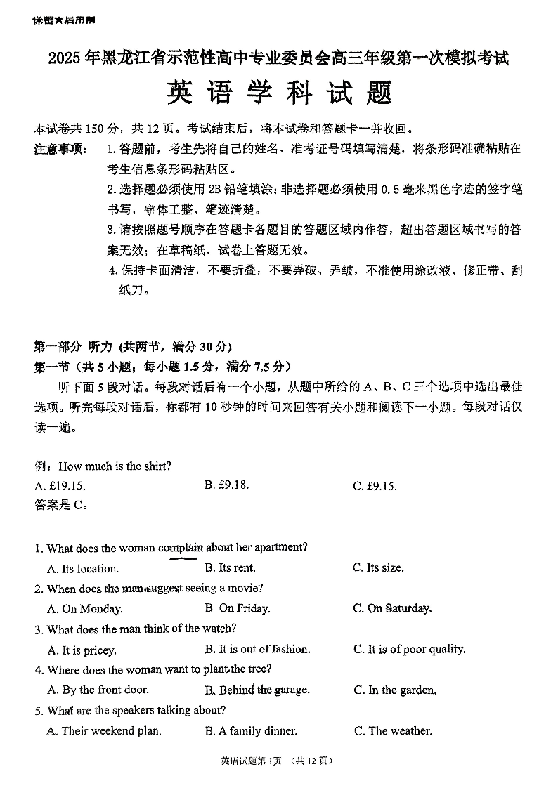黑龙江省教育学会示范性高中专业委员会2024-2025学年下学期高三第一次模拟英语