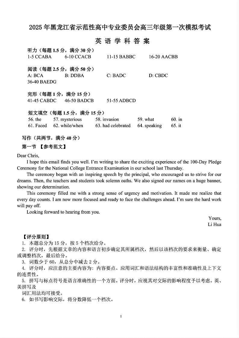 黑龙江省教育学会示范性高中专业委员会2024-2025学年下学期高三第一次模拟英语答案