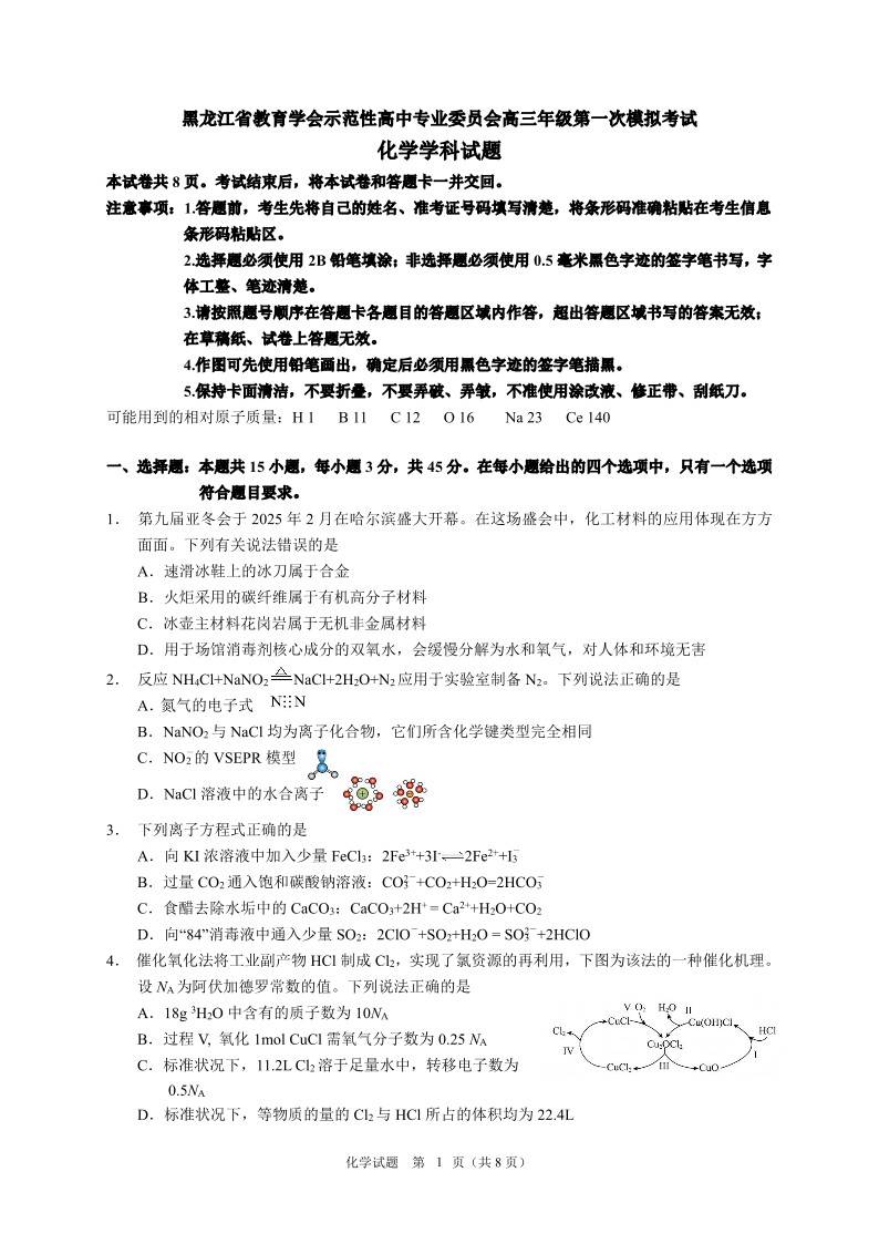 黑龙江省教育学会示范性高中专业委员会2024-2025学年下学期高三第一次模拟化学