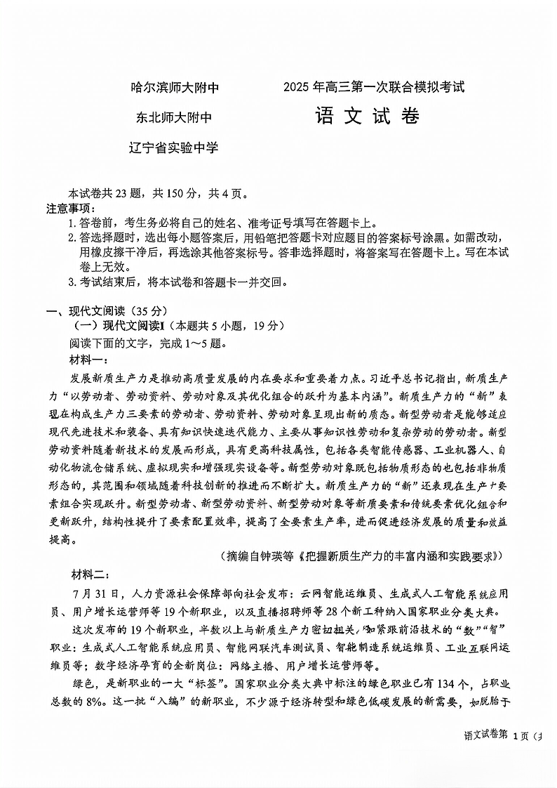东北三省三校2024-2025学年下学期三月第一次联合模拟语文