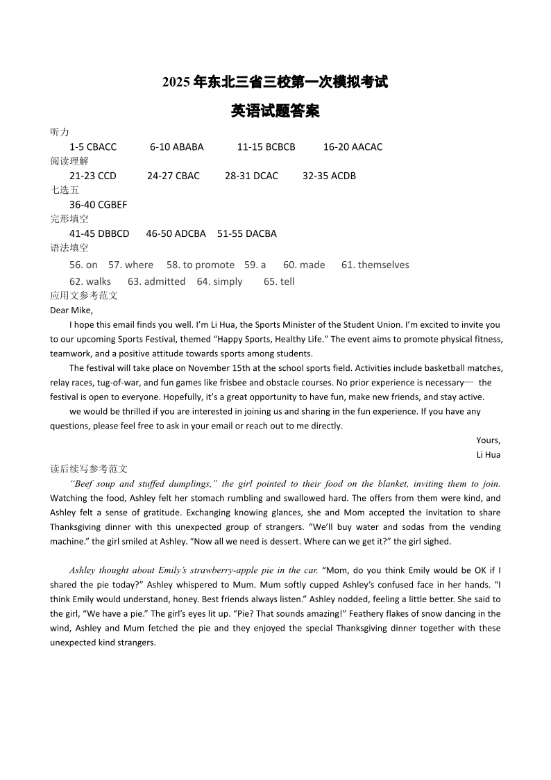 东北三省三校2024-2025学年下学期三月第一次联合模拟英语答案
