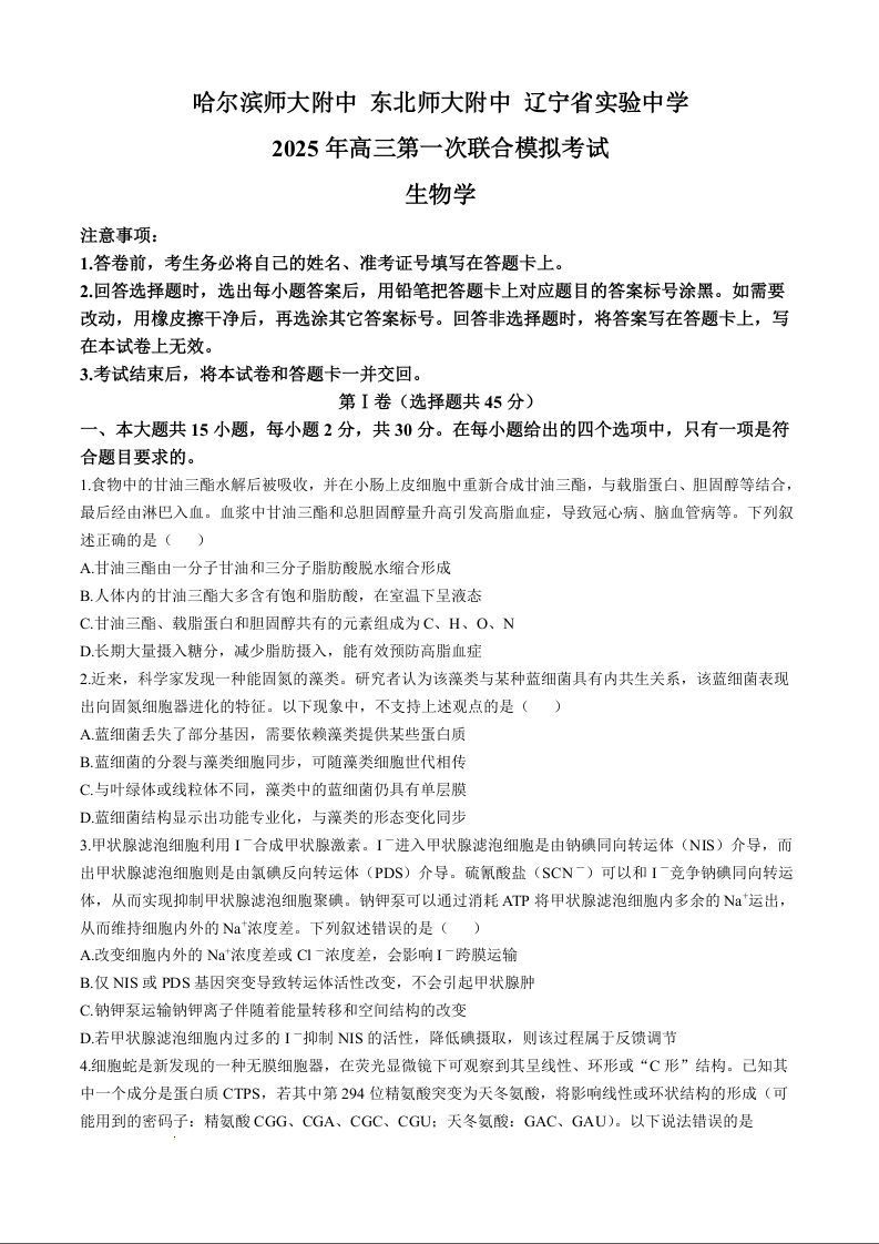 东北三省三校2024-2025学年下学期三月第一次联合模拟生物