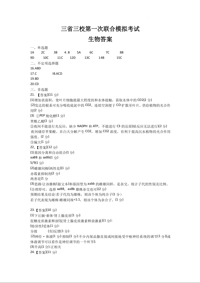 东北三省三校2024-2025学年下学期三月第一次联合模拟生物答案