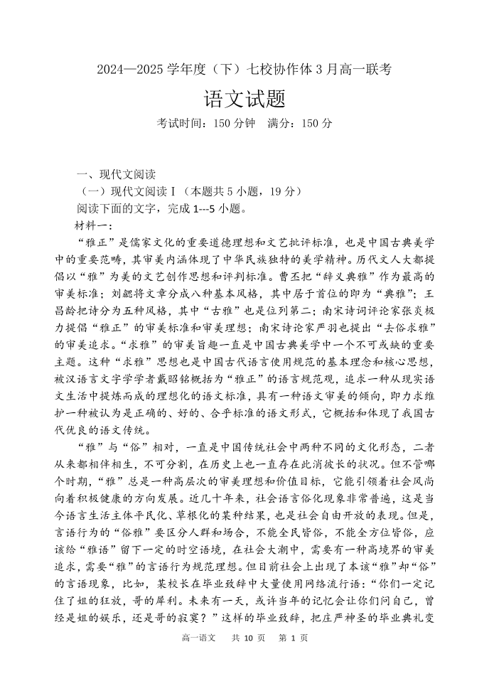 辽宁省七校协作体2024-2025学年下学期3月高一联考语文