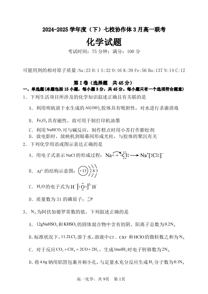 辽宁省七校协作体2024-2025学年下学期3月高一联考化学+答案