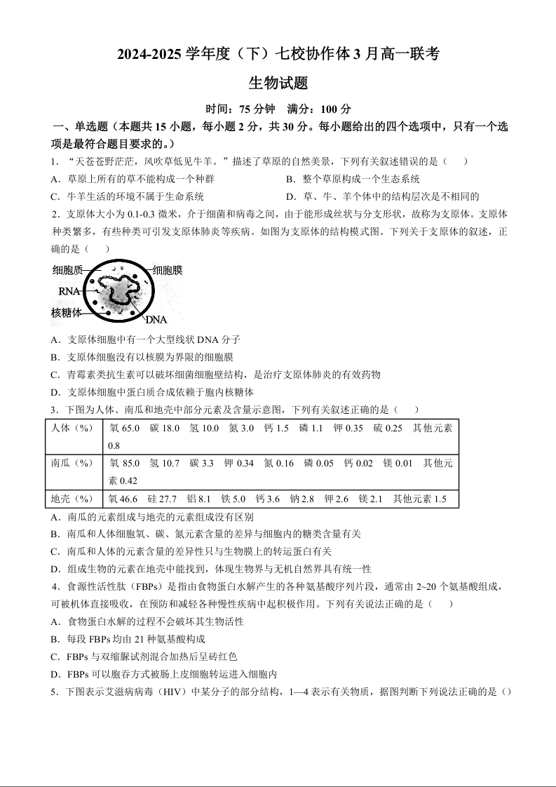 辽宁省七校协作体2024-2025学年下学期3月高一联考生物+答案