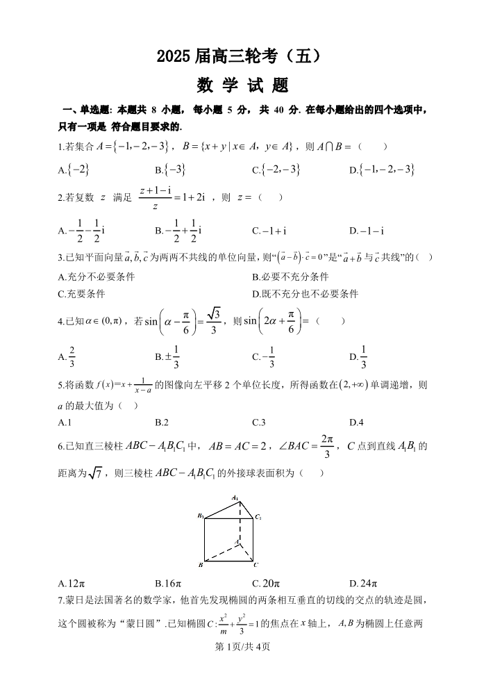 河南省信阳高级中学2024-2025学年下学期高三第五次轮考数学