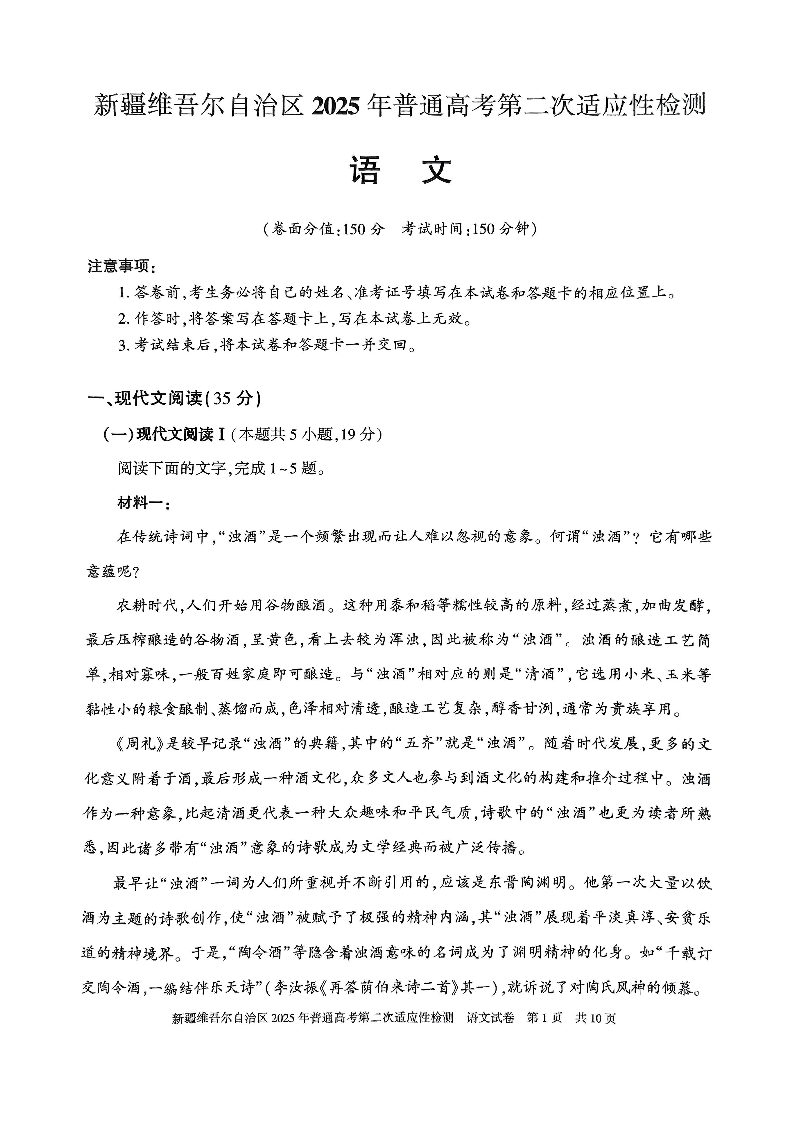 新疆维吾尔自治区2024-2025年普通高考第二次适应性检测(二模)语文