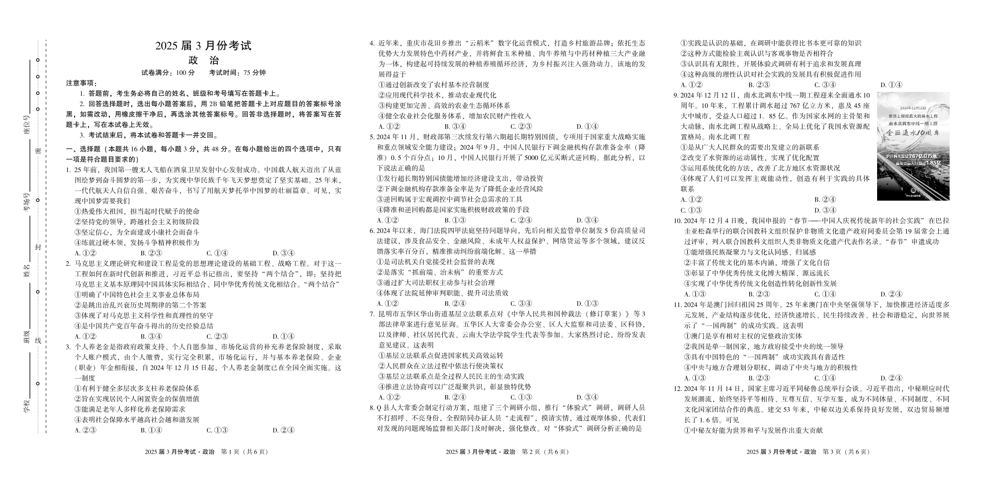 陕西省菁师联盟2024-2025学年下学期3月高三联考政治