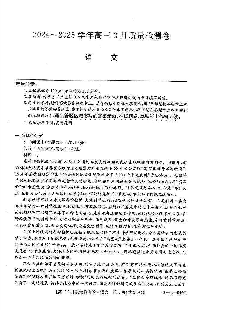 山西省三晋卓越联盟2024-2025学年下学期3月高三联考语文+答案