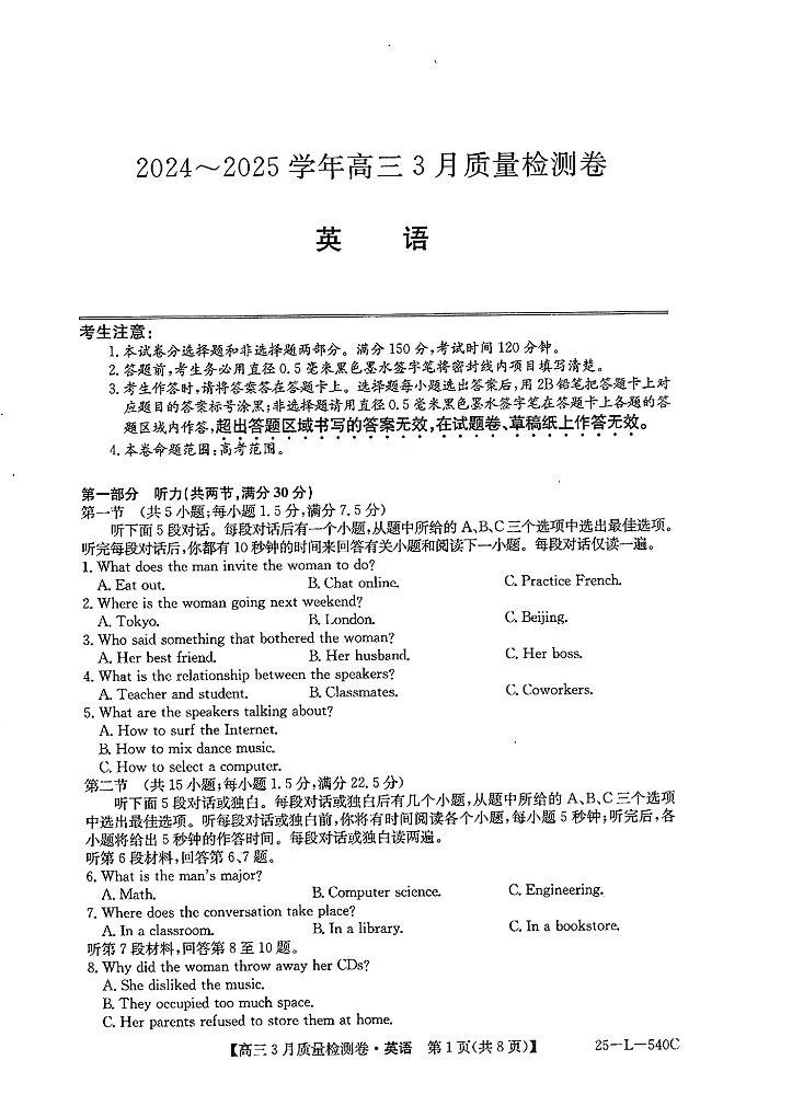 山西省三晋卓越联盟2024-2025学年下学期3月高三联考英语+答案