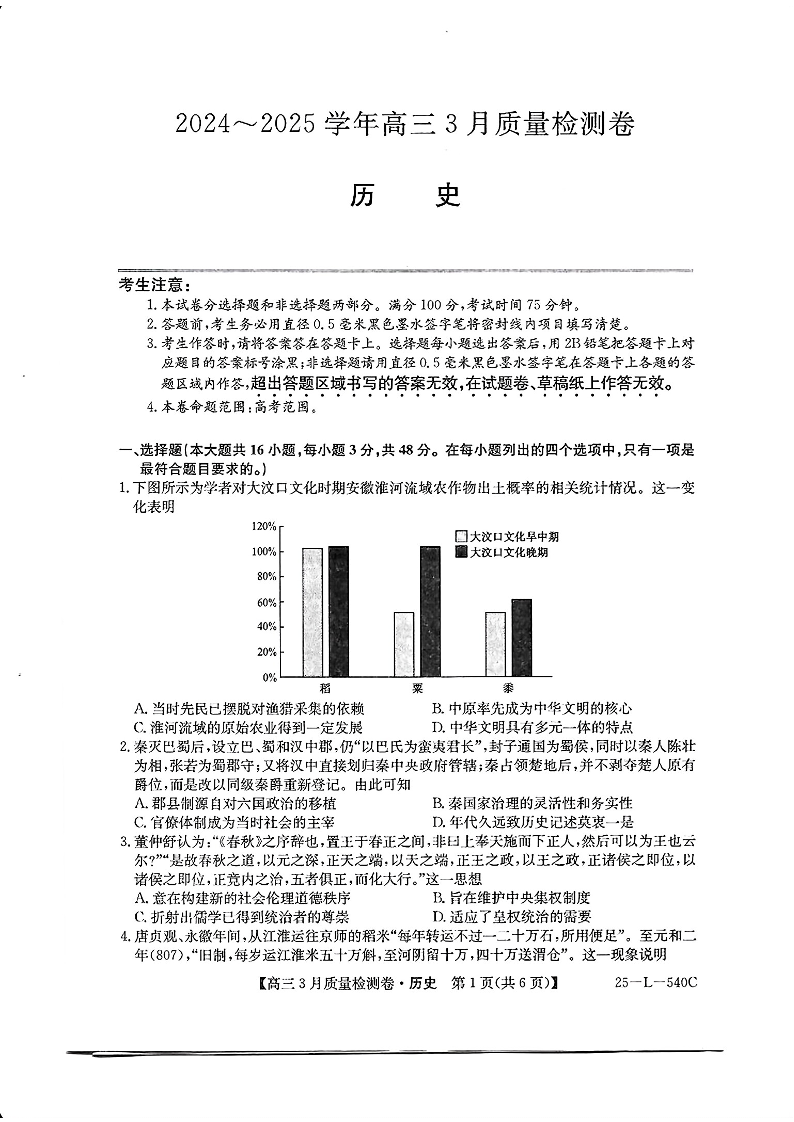 山西省三晋卓越联盟2024-2025学年下学期3月高三联考历史+答案