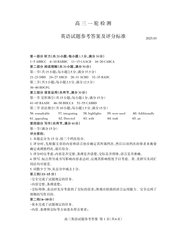 山东省泰安市2024-2025学年下学期3月高三一模检测英语答案