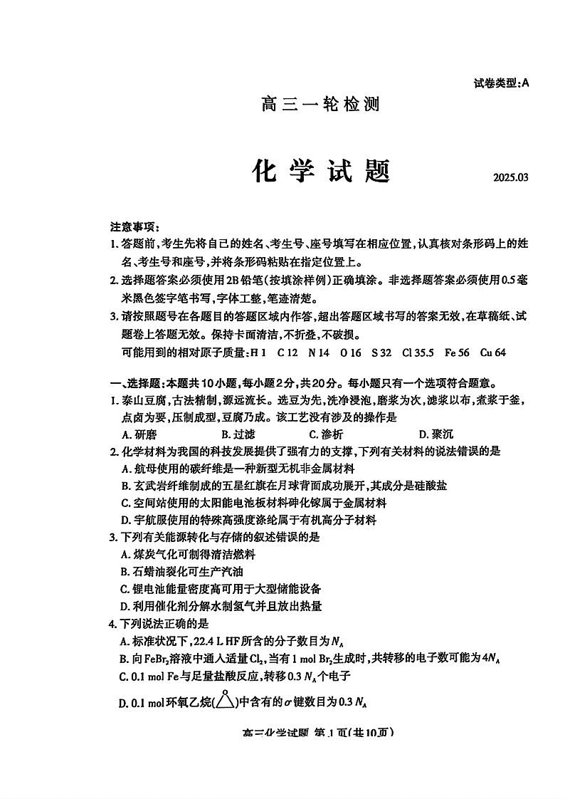 山东省泰安市2024-2025学年下学期3月高三一模检测化学