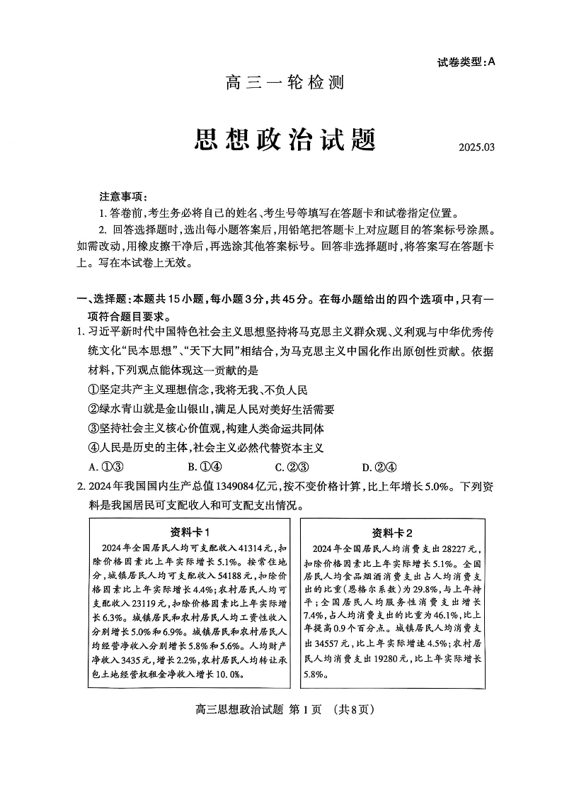 山东省泰安市2024-2025学年下学期3月高三一模检测政治