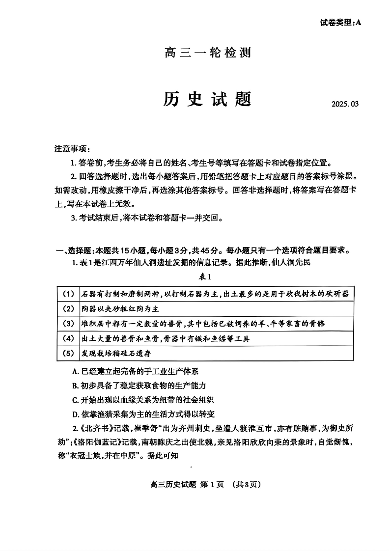 山东省泰安市2024-2025学年下学期3月高三一模检测历史