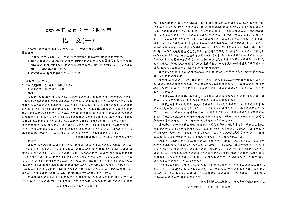 山东省聊城市2024-2025学年下学期3月高三一模考试语文
