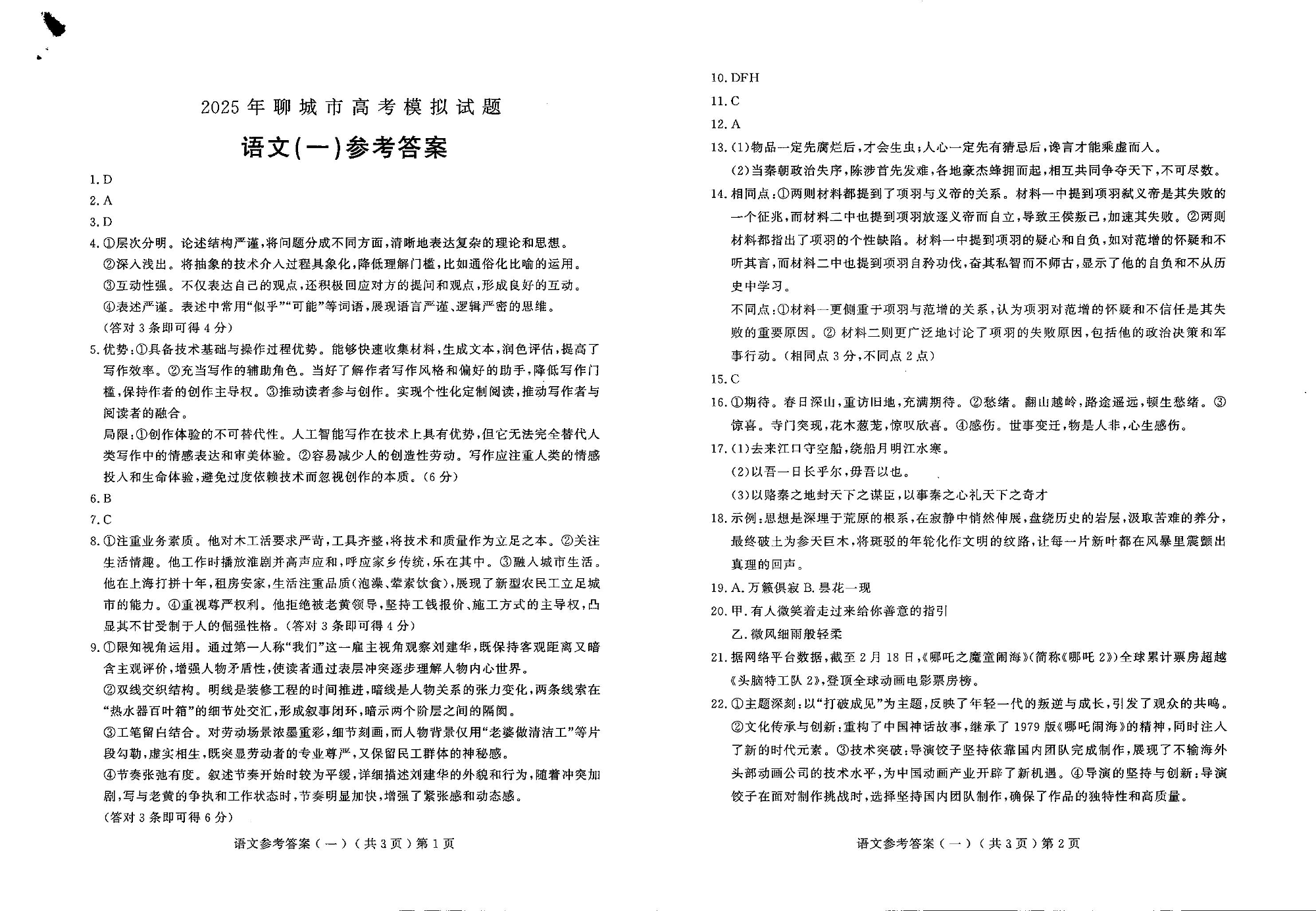 山东省聊城市2024-2025学年下学期3月高三一模考试语文答案