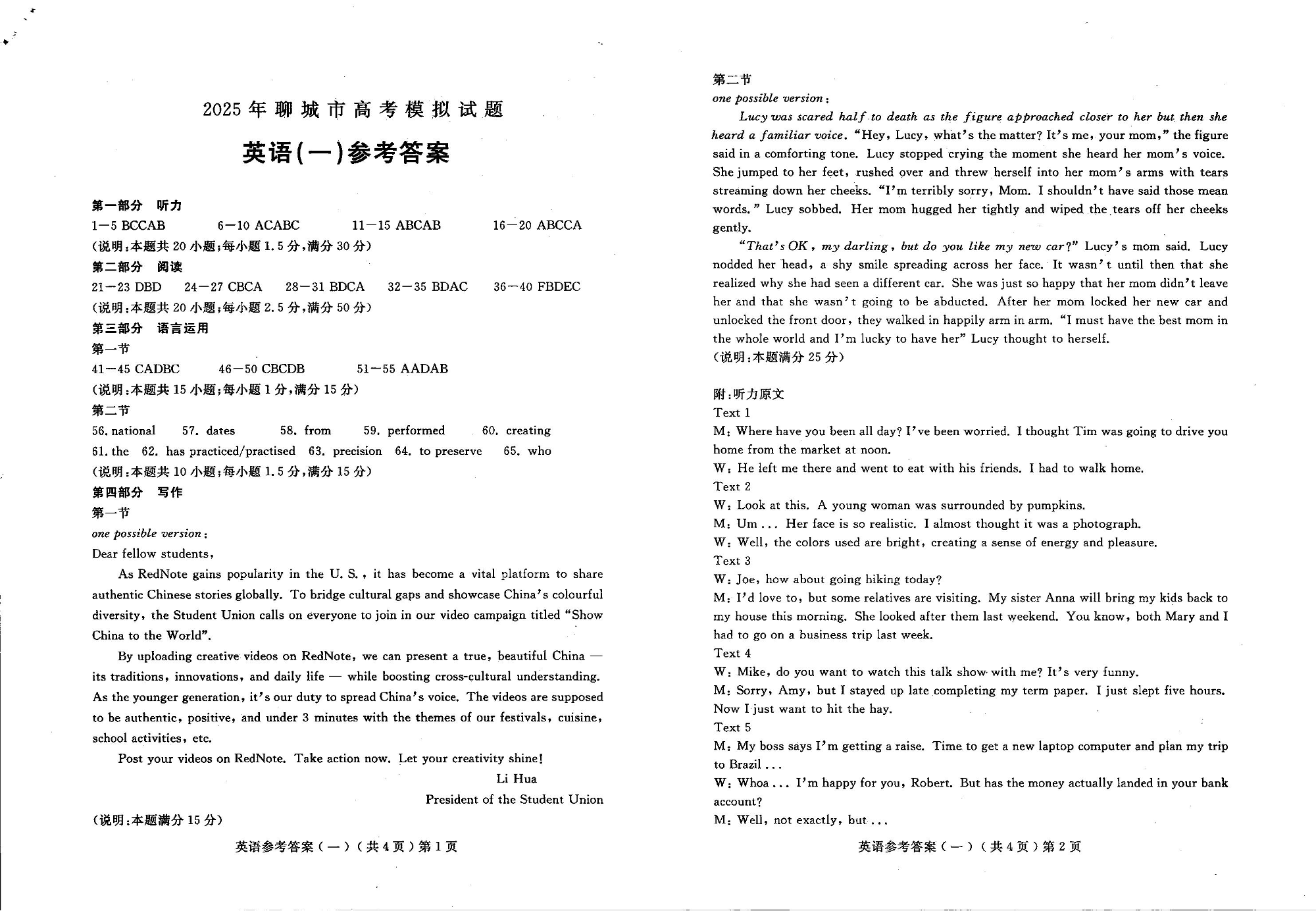 山东省聊城市2024-2025学年下学期3月高三一模考试英语答案