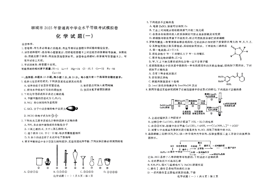山东省聊城市2024-2025学年下学期3月高三一模考试化学