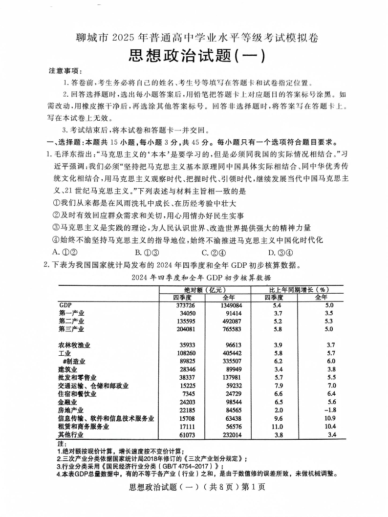 山东省聊城市2024-2025学年下学期3月高三一模考试政治