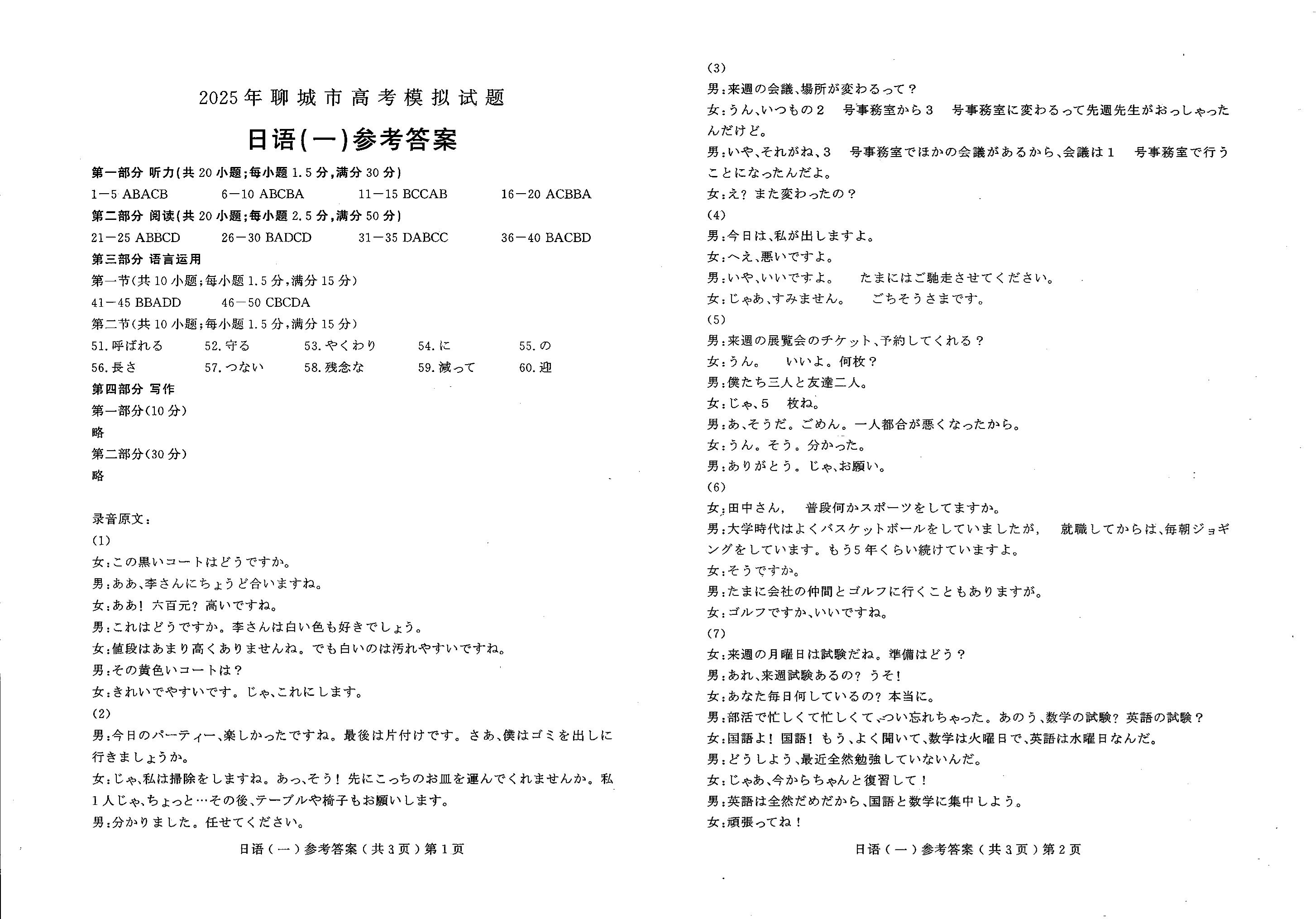 山东省聊城市2024-2025学年下学期3月高三一模考试日语答案