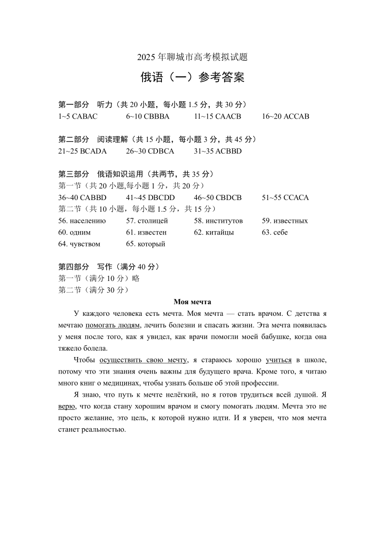 山东省聊城市2024-2025学年下学期3月高三一模考试俄语答案