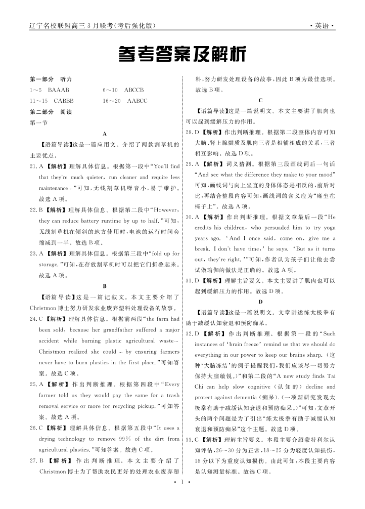 辽宁省名校联盟2024-2025学年下学期3月高三模考后强化卷英语答案