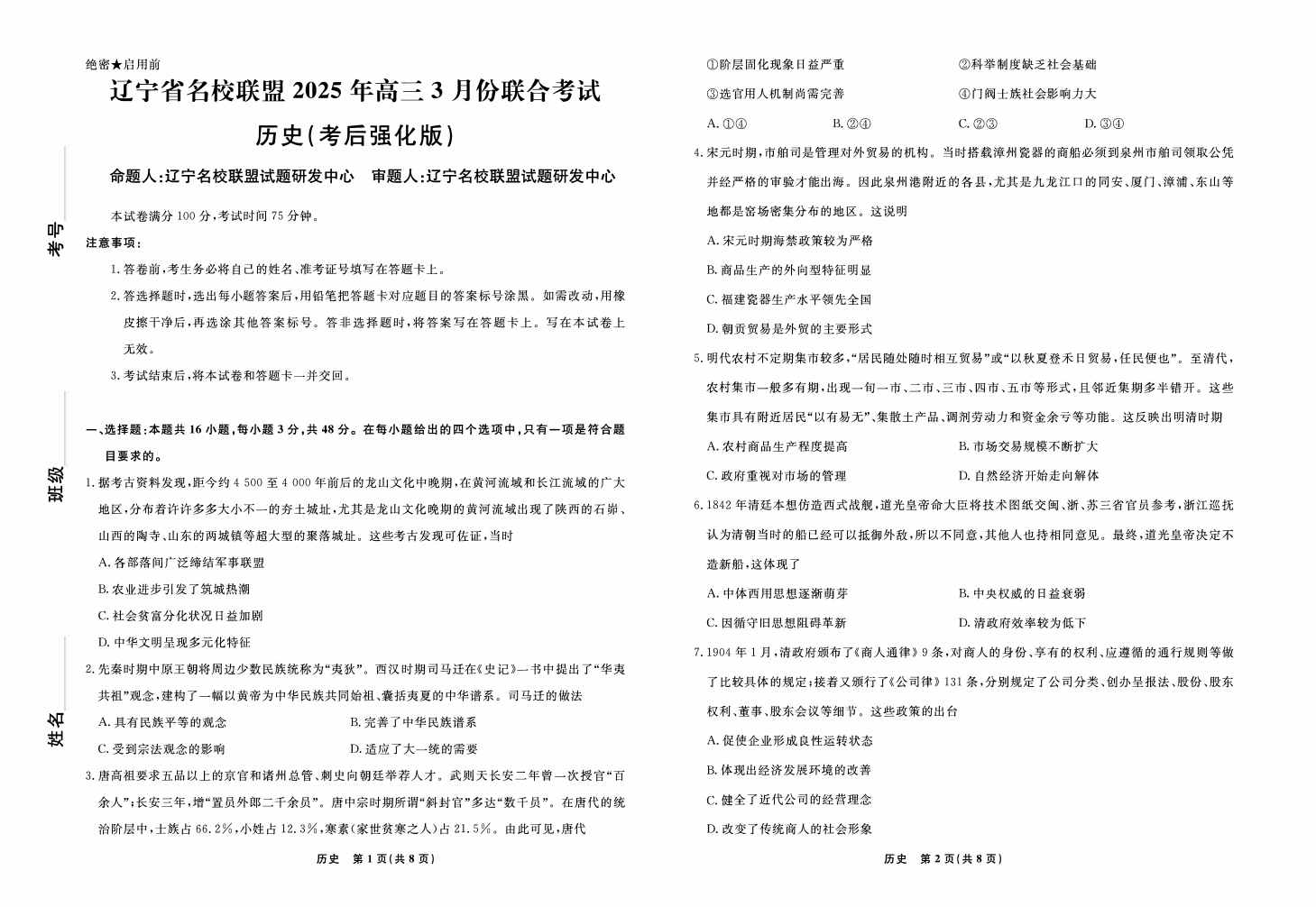 辽宁省名校联盟2024-2025学年下学期3月高三模考后强化卷历史