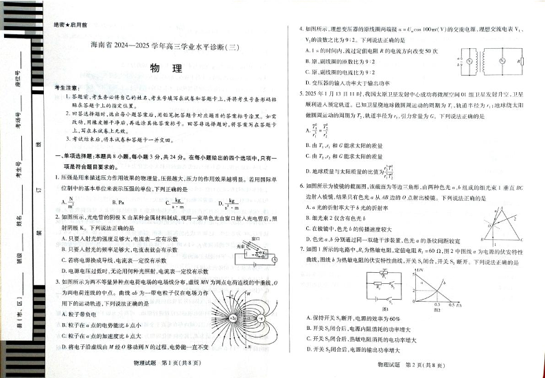 海南省区域高中2024-2025学年下学期3月高三学业水平诊断(三)物理