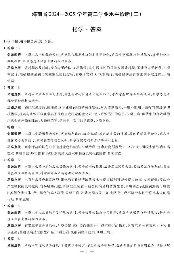海南省区域高中2024-2025学年下学期3月高三学业水平诊断(三)化学答案