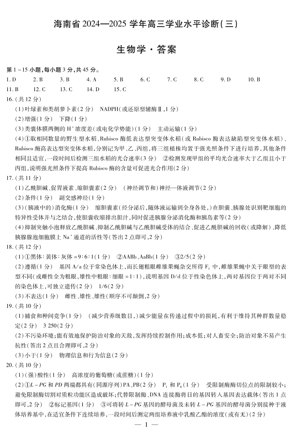 海南省区域高中2024-2025学年下学期3月高三学业水平诊断(三)生物答案