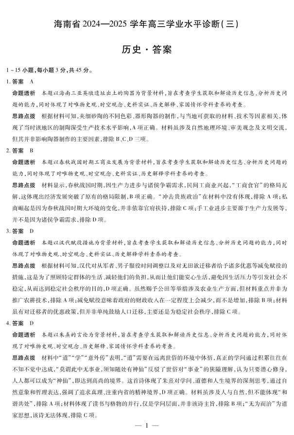 海南省区域高中2024-2025学年下学期3月高三学业水平诊断(三)历史答案