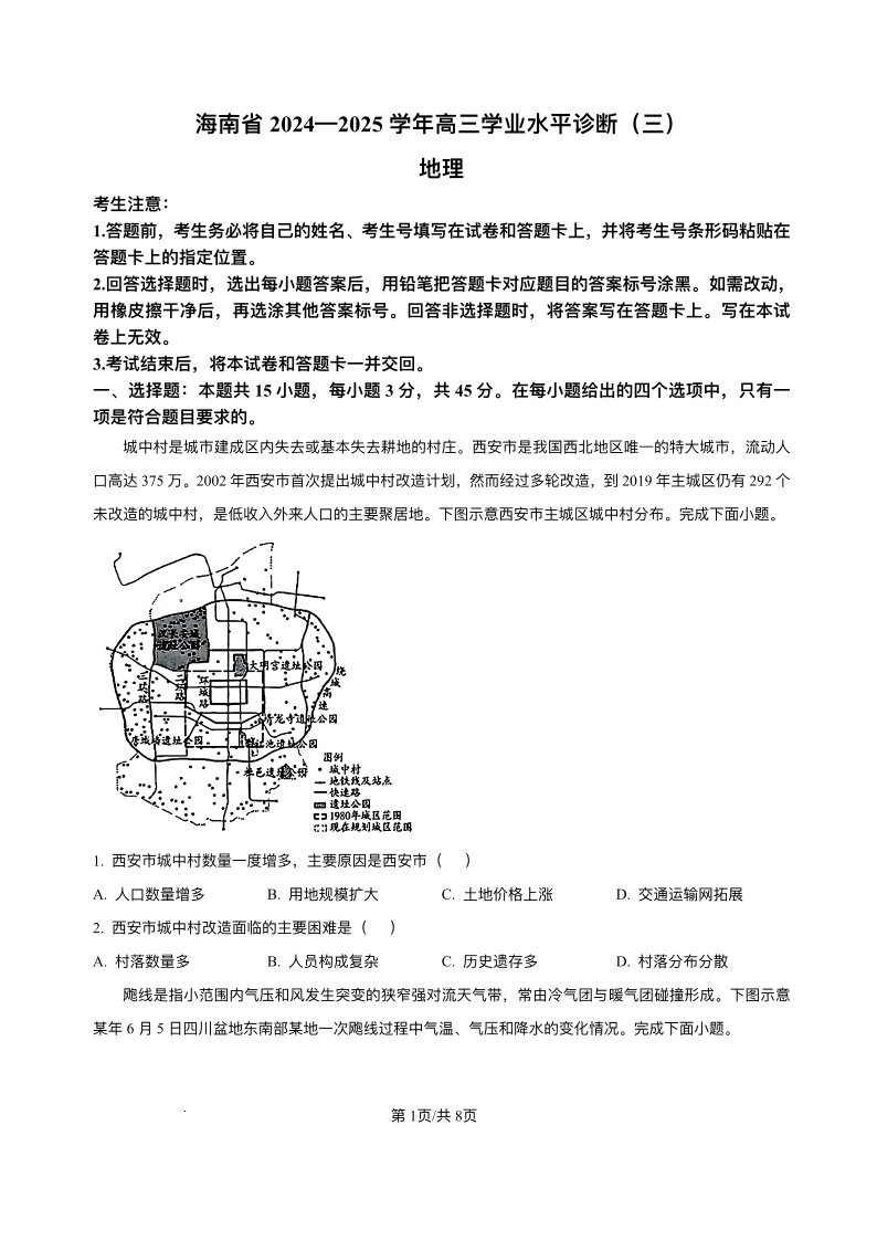 海南省区域高中2024-2025学年下学期3月高三学业水平诊断(三)地理