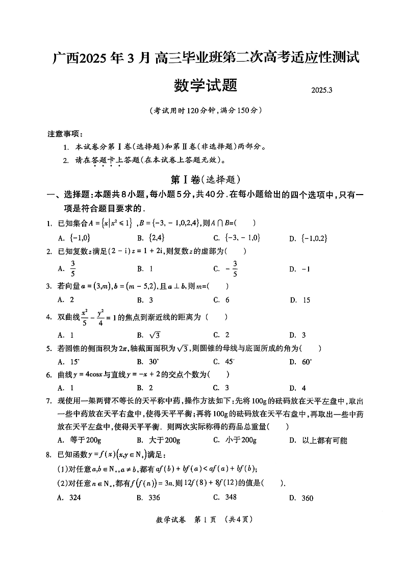 广西壮族自治区2024-2025学年高三第二次高考适应性模拟数学