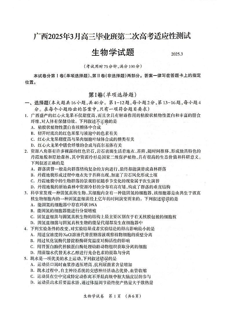 广西壮族自治区2024-2025学年高三第二次高考适应性模拟生物