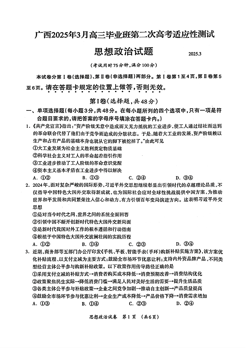 广西壮族自治区2024-2025学年高三第二次高考适应性模拟政治+答案