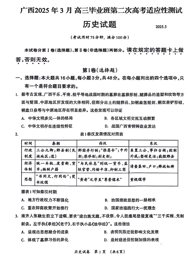 广西壮族自治区2024-2025学年高三第二次高考适应性模拟历史