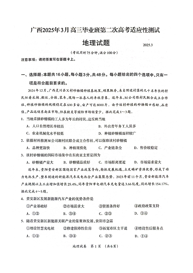 广西壮族自治区2024-2025学年高三第二次高考适应性模拟地理