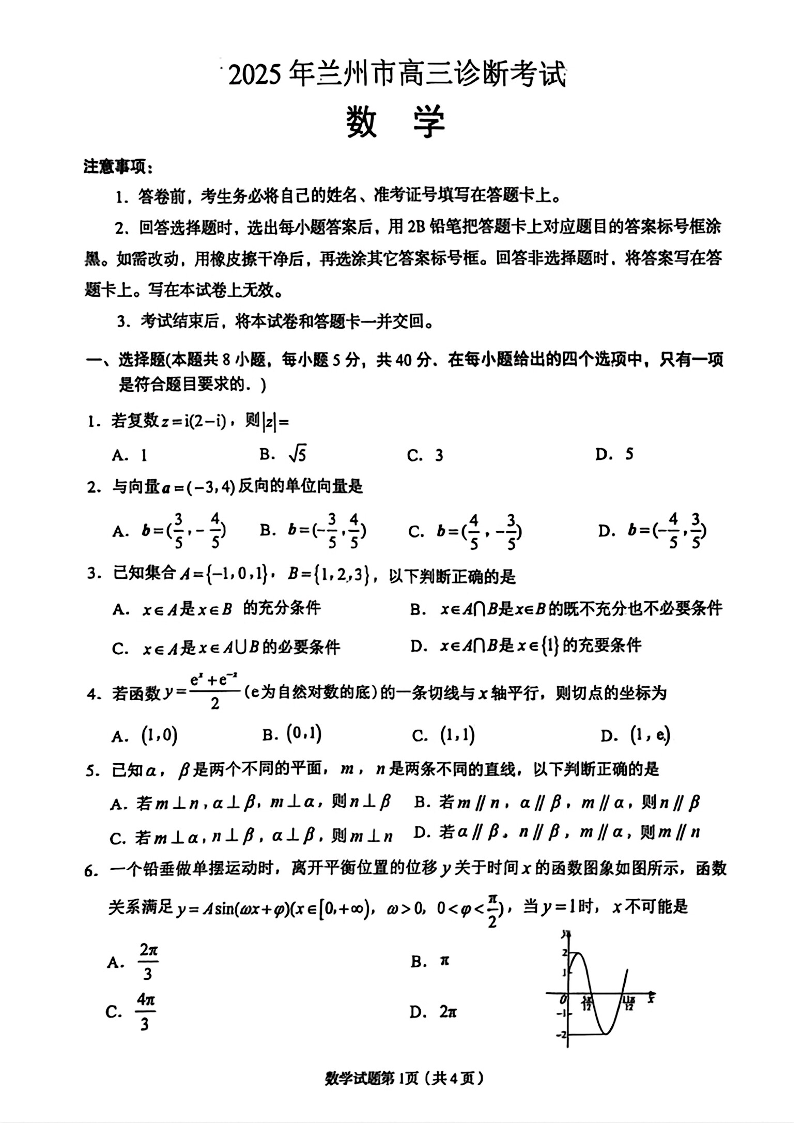 甘肃省兰州市2024-2025学年下学期高三诊断考试(一模)数学