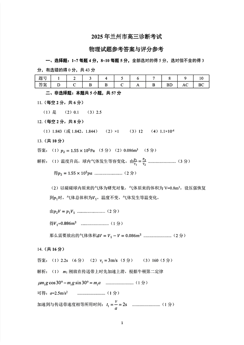 甘肃省兰州市2024-2025学年下学期高三诊断考试(一模)物理答案