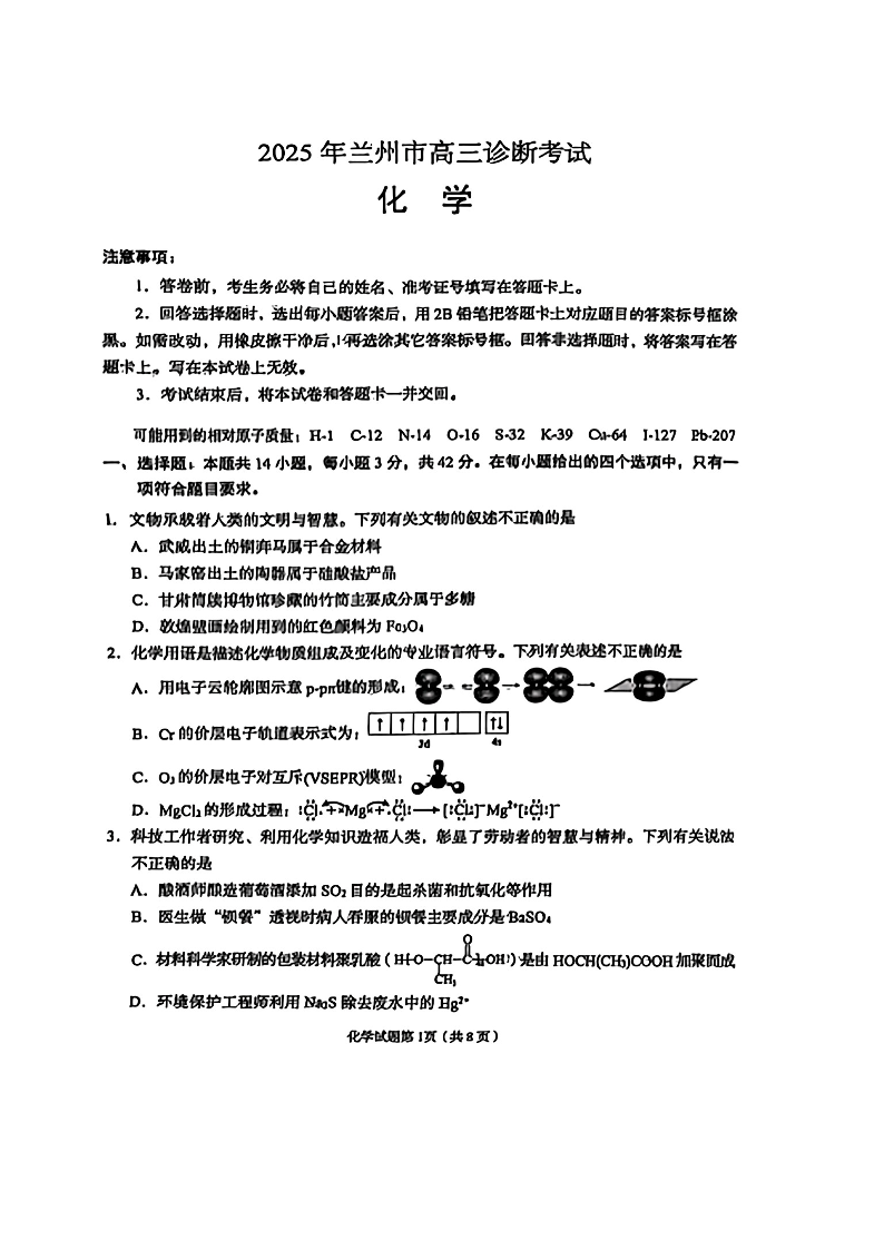 甘肃省兰州市2024-2025学年下学期高三诊断考试(一模)化学