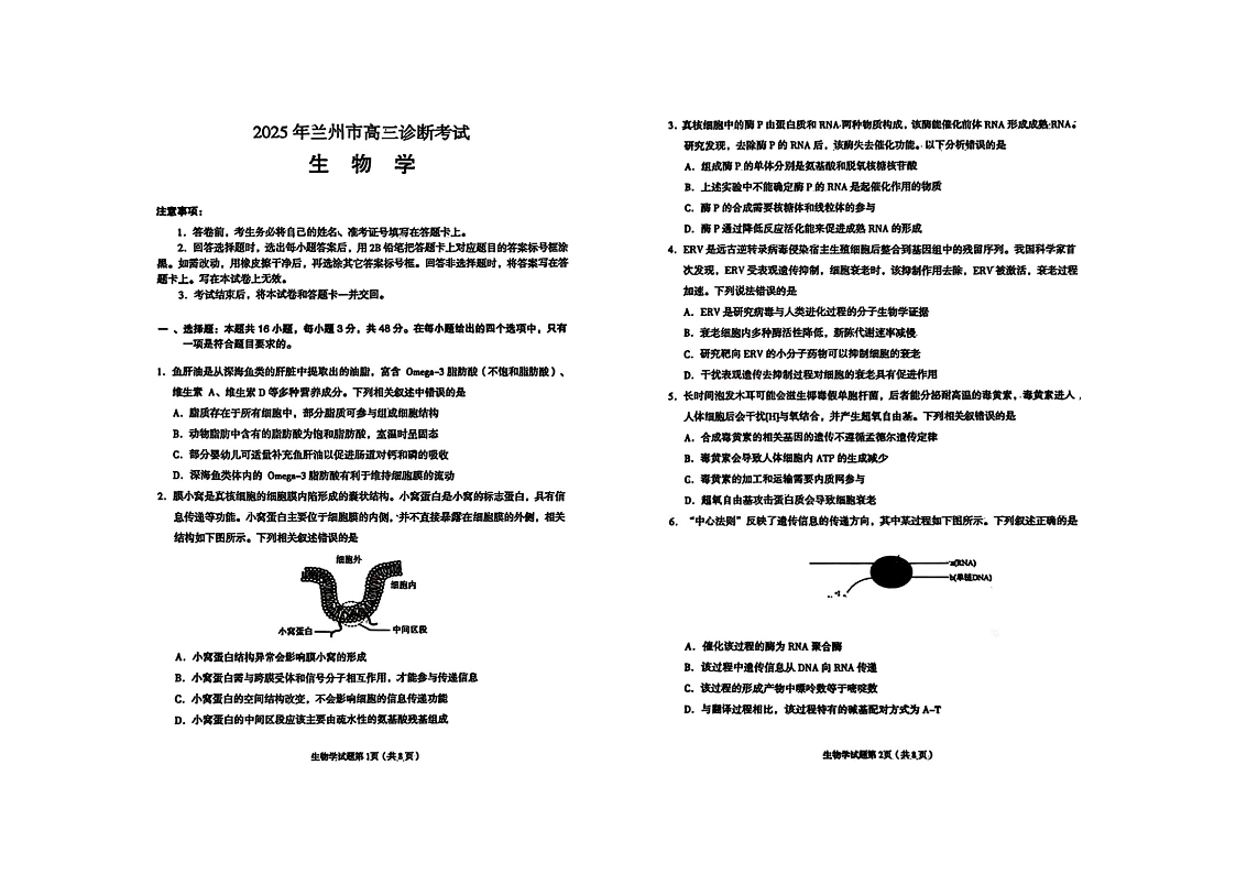 甘肃省兰州市2024-2025学年下学期高三诊断考试(一模)生物