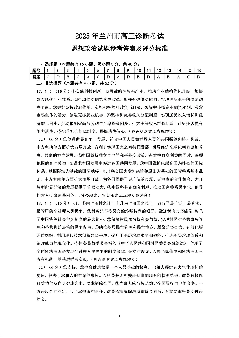 甘肃省兰州市2024-2025学年下学期高三诊断考试(一模)政治答案