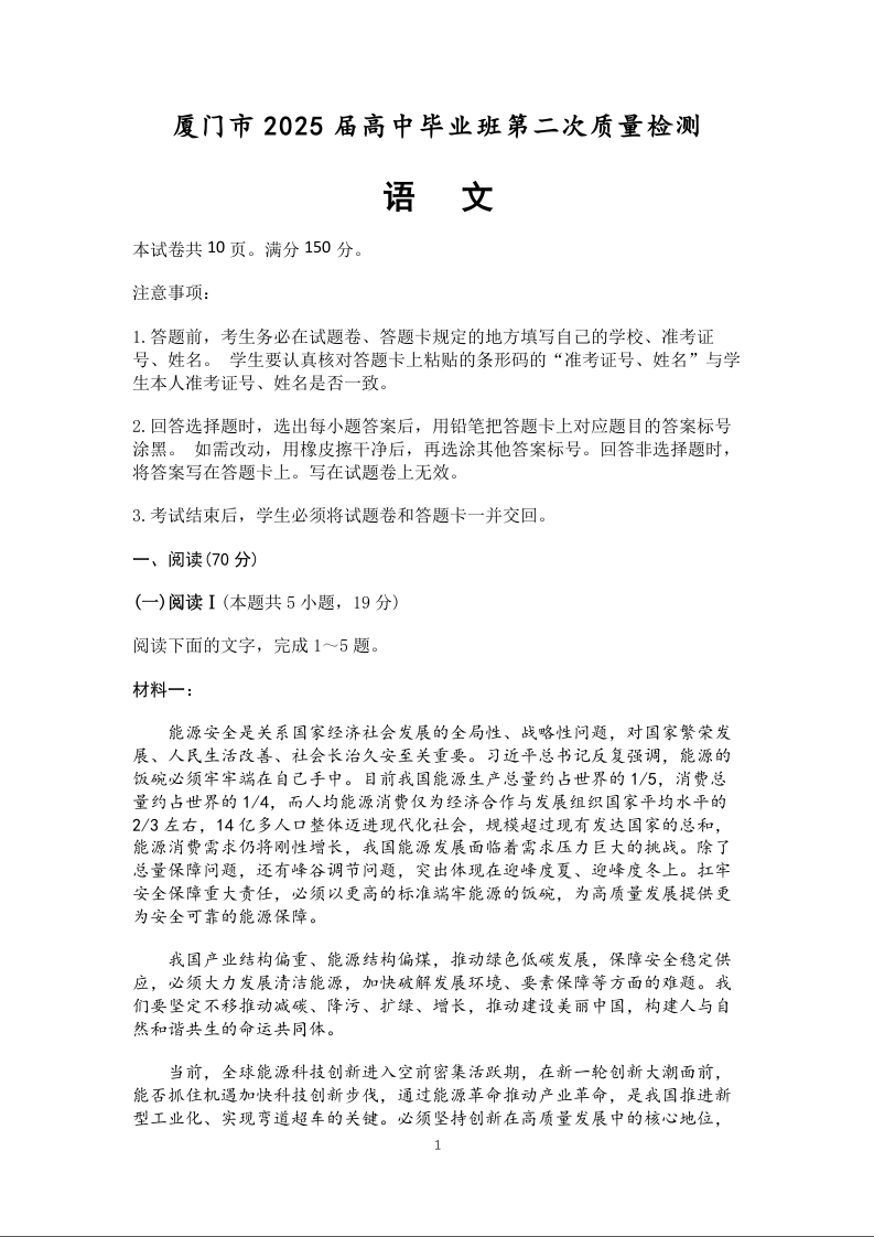 福建省厦门市2024-2025学年高三第二次质量检测(二模)语文+答案