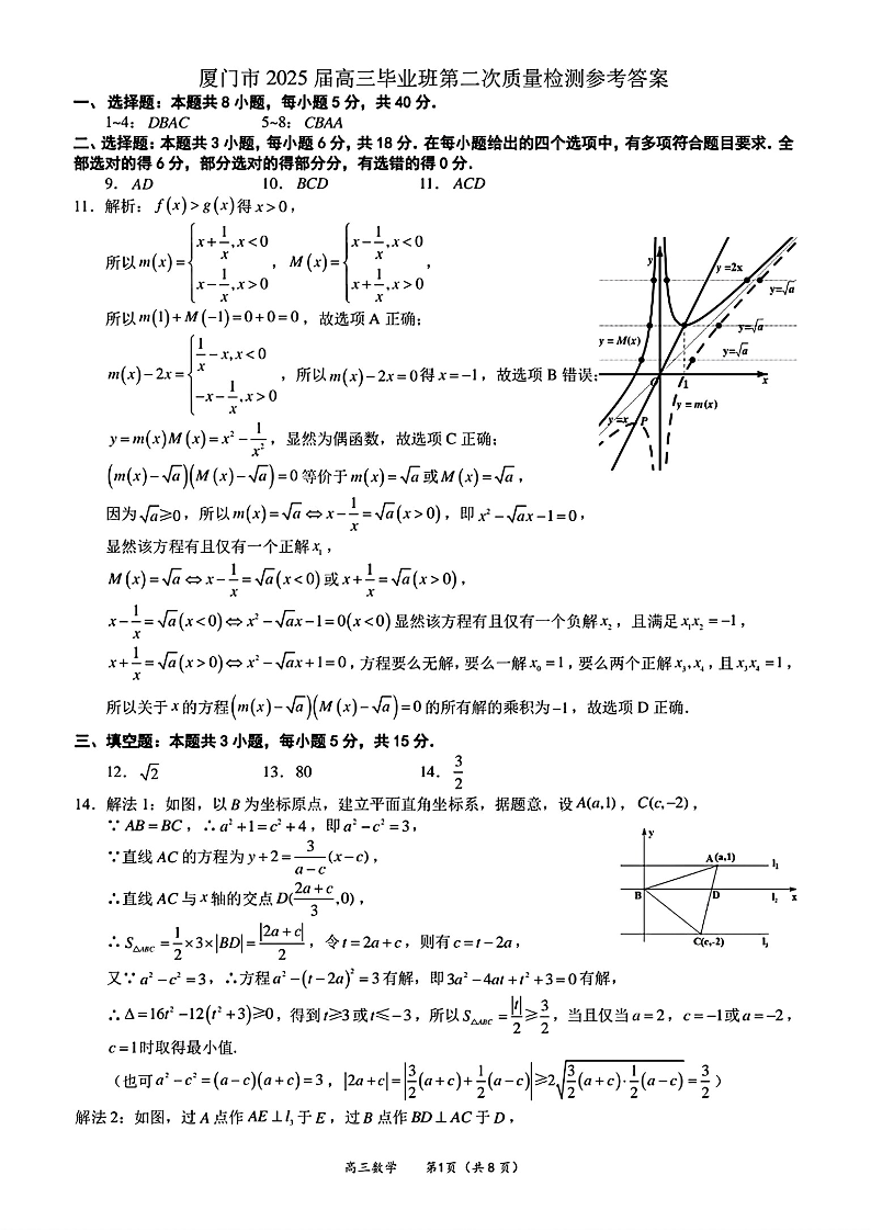 福建省厦门市2024-2025学年高三第二次质量检测(二模)数学答案