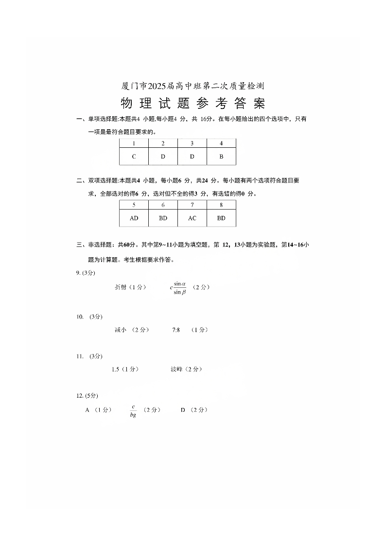 福建省厦门市2024-2025学年高三第二次质量检测(二模)物理答案