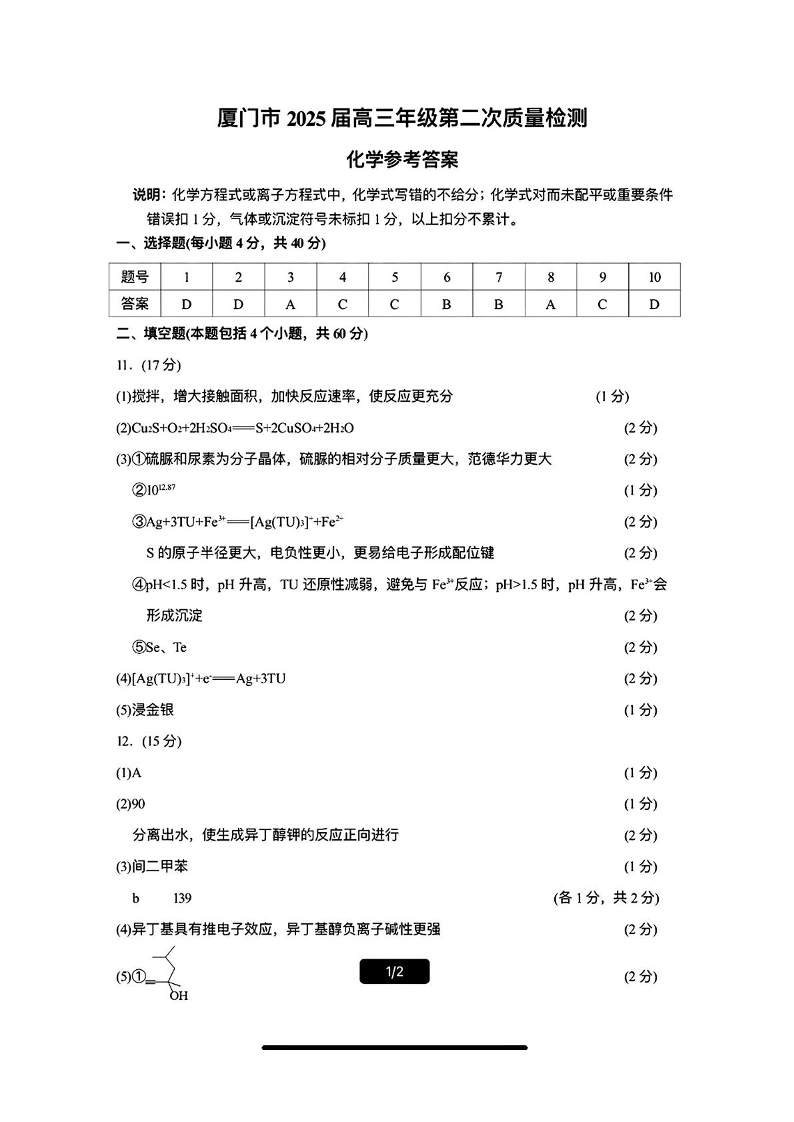 福建省厦门市2024-2025学年高三第二次质量检测(二模)化学答案